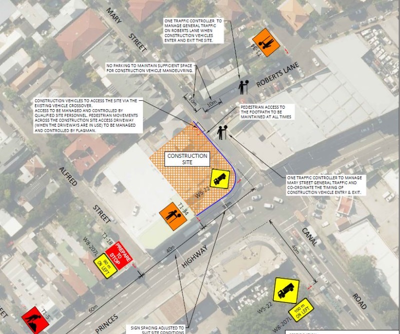 The construction site is located at the northwest corner of the very busy intersection of Princes Highway, Canal Road and Mary Street in St Peters.